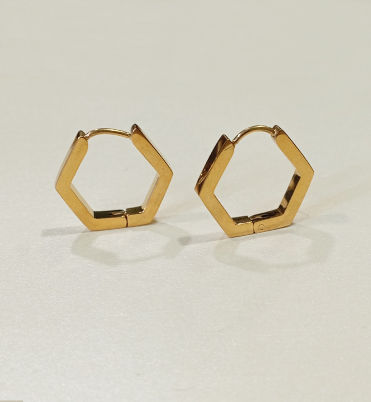Jolies boucles d’oreilles de forme hexagonale en acier inoxydable. Version redesignée de boucles d’oreilles créoles . Elles apportent une touche supplémentaire, simple et raffinée à chaque tenue. HxL : 2x2cm