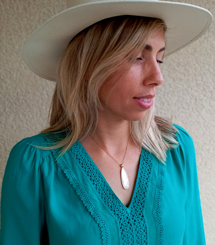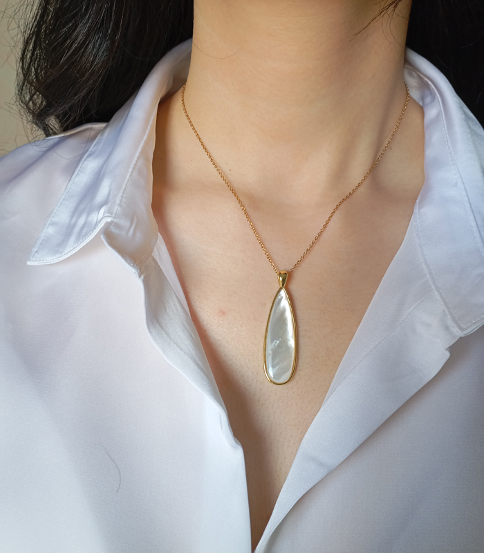 Joli collier composé d’une chaine en acier inoxydable et d’un pendentif en nacre serti de laiton. Un bijou lumineux qui ne passe pas inaperçu. Longueur : 40cm. Extension : 2cm. Pendentif hauteur : 4,7cm, largeur : 1,3cm