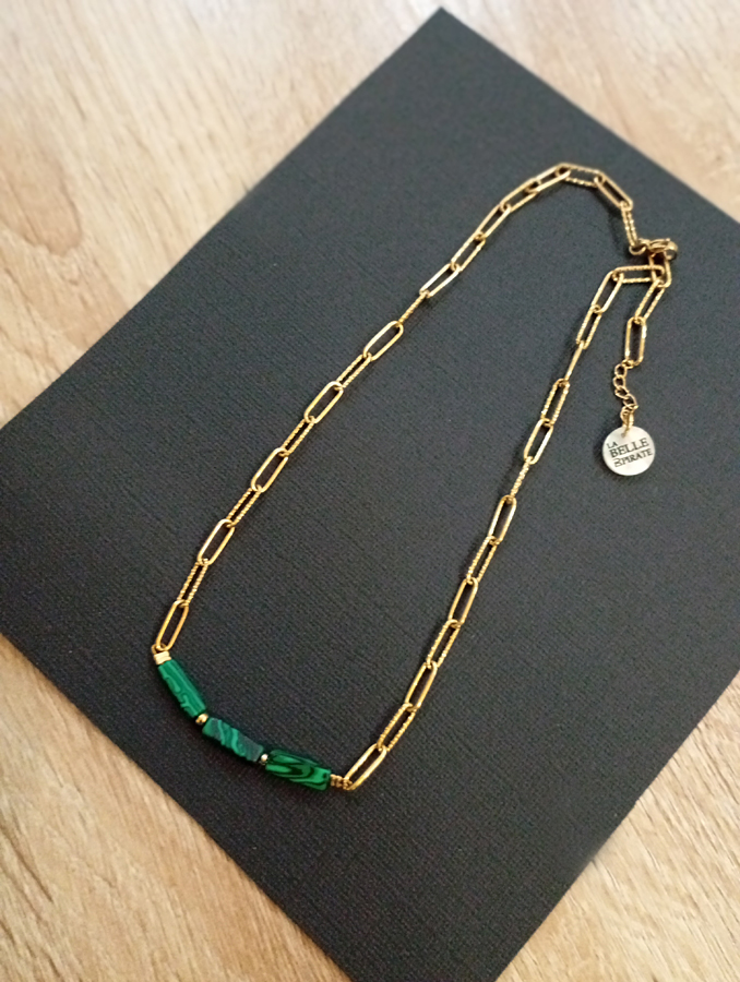 Les bijoux en acier doré sont tendance ! Ce collier solitaire en maille trombone en acier doré. La taille du maillon ovale est 1,3×0,4cm. L’acier inoxydable est hypoallergénique et solide. C’est un matériau très prisé en bijouterie. Le pendentif est un rang de malachite, cette pierre au vert intense striée de noire. Ce collier se porte aussi facilement pour les sorties qu’au quotidien. Il est à la fois discret, féminin, élégant et lumineux ! Création La Belle du Pirate